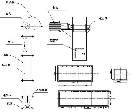 斗把物料從下面的儲藏中舀起,隨著輸送帶或鏈提升到頂部,繞過頂輪后向下翻轉(zhuǎn),